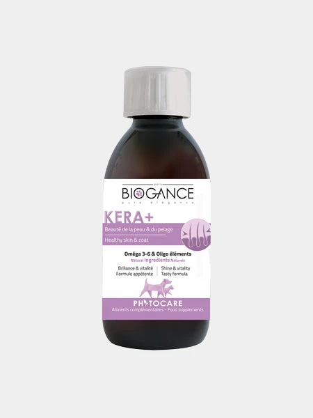 La gamme phytocare de Biogance vous permet d’améliorer la santé de votre Poilu de manière naturelle. Le complément Kera+ est enrichi en Oligo-éléments et en Omega 3 & 6. Il nourrit et hydrate le pelage sec, terne et fragile et participe à lui redonner de l’éclat et de la brillance. Il aide à réduire la chute du poil et soulage les démangeaisons. Il se présente sous format liquide et est facile à administrer grâce à son bouchon doseur.