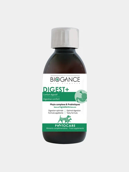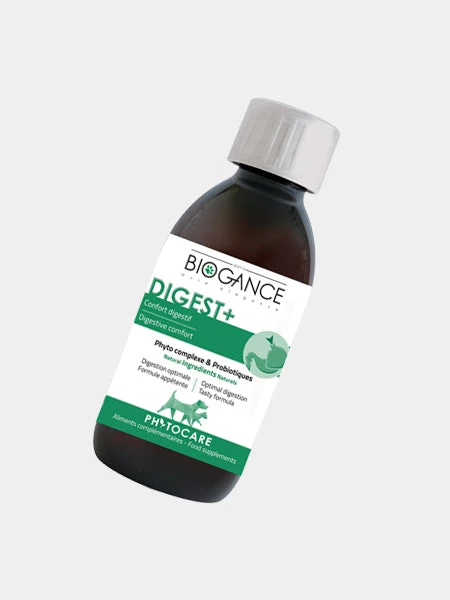 La gamme phytocare de Biogance vous permet d’améliorer la santé de votre Poilu de manière naturelle. Le complément Digest+ est enrichi en extraits de Chardon-marie, d’Anis vert et en Probiotiques. Il participe à améliorer le processus de digestion et améliore l’équilibre de la flore intestinale. Il aide aussi à éliminer les ballonnements et flatulences. Il se présente sous format liquide et est facile à administrer grâce à son bouchon doseur.
