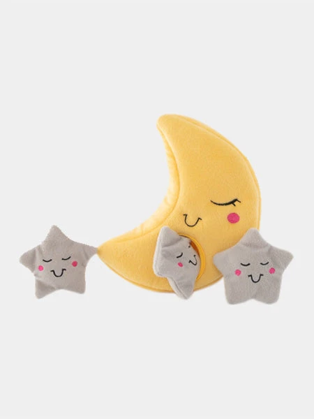 La Lune 🌛 et ses 3 petites étoiles ⭐⭐⭐ de Zippy Paws est un véritable jouet d’occupation en peluche pour chien. Montrez les petits jouets à votre Poilu en pressant sur le squeaker puis cachez les à l’intérieur ! Le couinement permet de stimuler votre chien pendant le jeu.